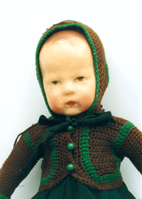 42 cm große Stoffpuppe mit angenähten Daumen von 1915-1920, gestrickte Kleidung original.